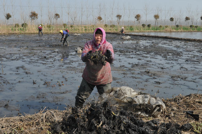 雖已初春,乍暖還寒。春節(jié)過后,淮海農(nóng)場愛蓮苑水生花卉基地里就是一派忙碌。每天,農(nóng)場下崗職工陸寶珍正常與其他10多名員工一起,頭戴著圍巾,穿著水褲,手持小鍬,拖著塑料薄膜,在睡蓮池中采摘睡蓮的根芽。等采集到一定量后,就按規(guī)格進(jìn)行分撿、計數(shù)打包,隨即按公司訂單需求,銷往全國各地甚至從海空渠道托運到國外市場。