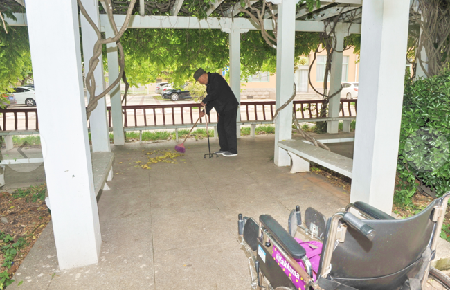 “開始掃地時,我把掃帚和簸箕放在綠化叢中,沒曾想,僅過了一周,掃地的工具不見了蹤影,以后,我只好每天上午或是中午,提前帶著掃帚簸箕和抹布來這里揩擦打掃,在其他老人還沒到來之前,掃清長椅地面,揩去鳥蟲屎后,再垃圾倒入100米開外的垃圾桶中。”楊文才告訴我。