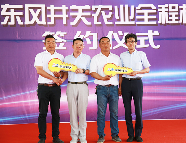 胡兆輝、盧鋒共同為新洋分公司、東辛分公司農(nóng)業(yè)全程機械化示范園授牌。蘇志富、葉常青分別代表雙方企業(yè)簽約。丸尾、詹黎明分別為用戶代表頒發(fā)交機鑰匙。