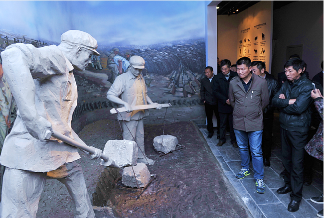 想當(dāng)年在建場(chǎng)初期的那“三大戰(zhàn)役”中,農(nóng)建四師的將士們,就是用鍬挖,用扁擔(dān)挑的大無畏革命精神,涌現(xiàn)了許許多多像“江大鍬”“仇大筐”式的英模人物。正如陳毅元帥所說的那樣,他盛贊農(nóng)建四師的廣大將士是“皇帝的氣派(當(dāng)家作主),叫花子的干法(艱苦奮斗)。當(dāng)時(shí)華東軍政委員會(huì)兩次給予通報(bào)表揚(yáng),中央電影制片廠還專門來到農(nóng)建四師拍攝了專題紀(jì)錄片。2017年陳列館二期工程建造時(shí),為更加形象地弘揚(yáng)農(nóng)建四師的“艱苦奮斗、不怕困難、團(tuán)結(jié)奮進(jìn)、無私奉獻(xiàn)”的精神,主辦方還特地建造了這兩尊雕塑。