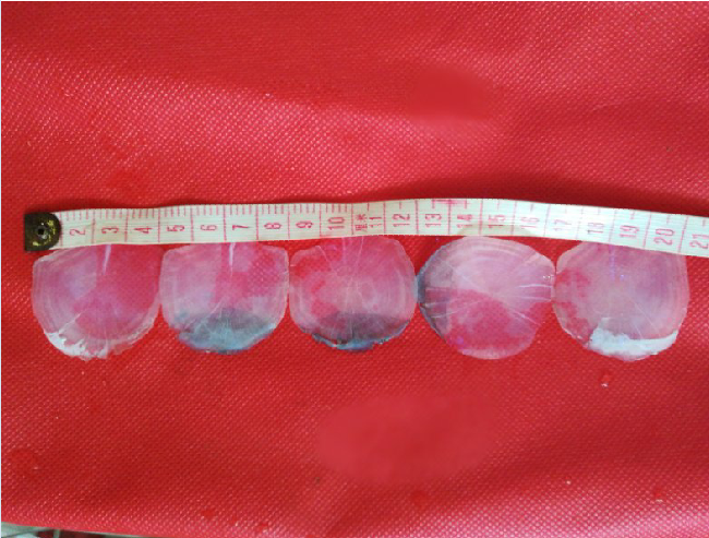 “到底是一條大魚,魚鱗比1元硬幣還大呢!”一圍觀群眾特意到附近裁縫店里找來一把布尺,從魚身上取下五個魚鱗,將五個魚鱗緊密地靠在一起,排成一線,然后用布尺量了一下,五個魚鱗長近21厘米,平均每個魚鱗直徑有4厘米多。