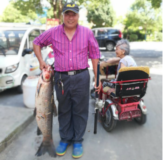 圍觀的人請袁幕輝將魚拎起來,看看有多長?袁幕輝將魚拎起來,魚頭超過了他的腰眼;袁幕輝的孫子金小貝看到爺爺釣到一條大魚,高興地圍著爺爺轉(zhuǎn)來轉(zhuǎn)去:“喲,這么大的魚!比我還高喱。”。幫助袁幕輝將魚從水里弄上來的辛師傅,拎著大青魚到附近菜市場的磅秤上稱一下,即使大青魚半截尾巴拖在地上,魚頭還超過了他的腰眼。他稱了一下,這條大青魚正好35斤。