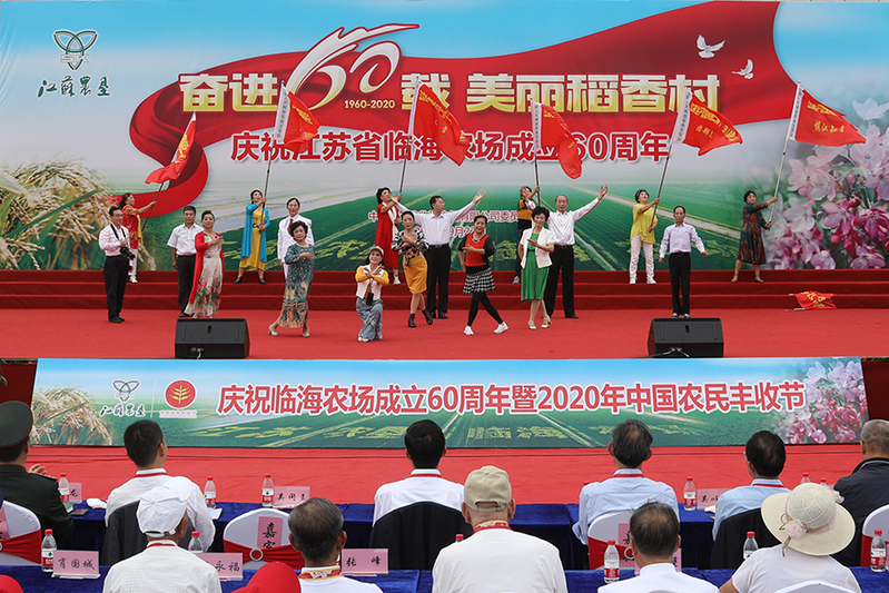 慶祝大會圓滿結束后,參加活動的領導、來賓與職工群眾一同觀看了場慶文藝演出。職工表演的鼓樂《歡慶》、舞蹈《幸福中國一起走》《我們都是追夢人》、古箏演奏《南泥灣》《在希望的田野上》、縣淮劇團的淮歌《愛不夠的地方是農(nóng)場》抒發(fā)了人們熱愛農(nóng)場、建設農(nóng)場的豪壯志情。鎮(zhèn)江知青的情景劇《臨海大地在呼喚》、鳳陽花鼓《春風吹綠花鼓鄉(xiāng)》、無錫知青的詩朗誦《臨海農(nóng)場,我的第二故鄉(xiāng)》,讓人們仿佛回到了崢嶸歲月,重溫60年艱辛光榮的奮斗史。情景朗誦《禮贊六十年》、歌伴舞《走向新輝煌》表達了臨海人的美好愿景,將文藝演出推向了高潮。