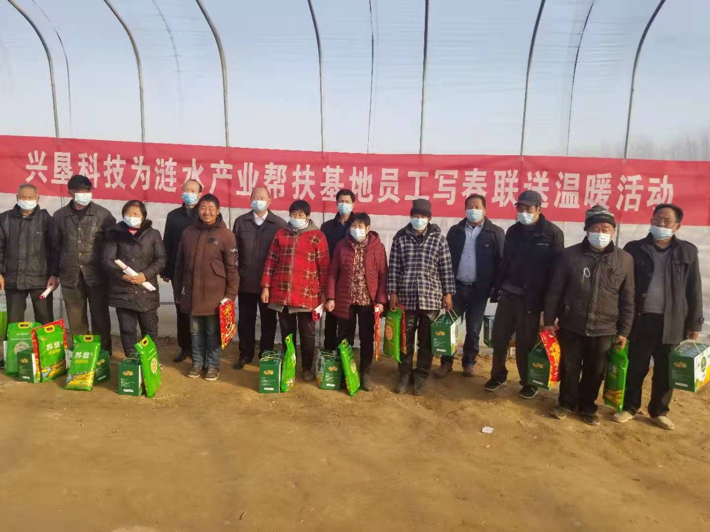 春節(jié)將至,幫扶情深。2021年2月4日下午,江蘇農(nóng)墾興墾農(nóng)業(yè)科技有限公司董事長、總經(jīng)理陳叢林、副總經(jīng)理楊育清、馬傳武一行到漣水產(chǎn)業(yè)幫扶基地開展寫春聯(lián)送溫暖慰問活動,為基地村民送上組織的關(guān)懷和新年的祝福。漣水縣林場村支部書記陳法寶一同參加慰問活動。