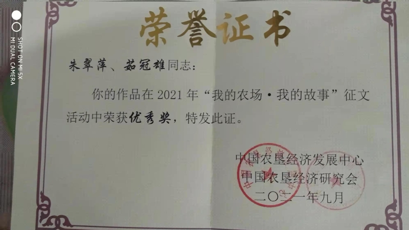 近日,弶港農(nóng)場杜鵑居委會(huì)黨員朱翠萍、茹冠雄夫婦收到了中國農(nóng)墾經(jīng)濟(jì)發(fā)展中心,中國農(nóng)墾經(jīng)濟(jì)研究會(huì)寄來的2021年“我的農(nóng)場,我的故事”征文獲獎(jiǎng)榮譽(yù)證書。