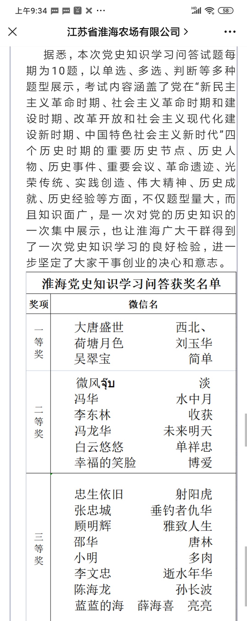 “作為農場老干部,我一直關注淮海農場的大事,這次為慶祝中國共產黨成立100周年大慶,農場黨委工作部去年6月1日通過微信公眾號發(fā)布的答題頁面進行答題活動時,我本著試試看的心理,第一次答題結束就獲得了100分,讓我的信心大增?!背潭ɑ陬I獎名單上簽上自己的名字后興趣盎然地說,“于是在接下來的每周黨史知識學習問答試題,我都是認真對待,直到推出了26期淮海黨史學習教育知識問答全部結束。”
