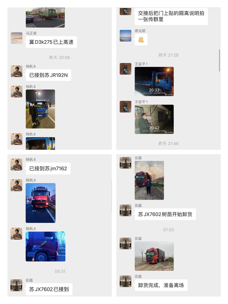 “冀D3k275已上高速”“已接到蘇JR192N”“空車回場(chǎng),行程碼無星號(hào),居家隔離”“蘇JX7602樹苗開始卸貨”……弶港農(nóng)場(chǎng)“疫”線黨員突擊隊(duì)微信群里的工作匯報(bào)內(nèi)容簡短,工作流程圖像清晰,值班人員和應(yīng)急小組24小時(shí)在線,全力為場(chǎng)域內(nèi)企業(yè)企業(yè)穩(wěn)產(chǎn)保供保駕護(hù)航。