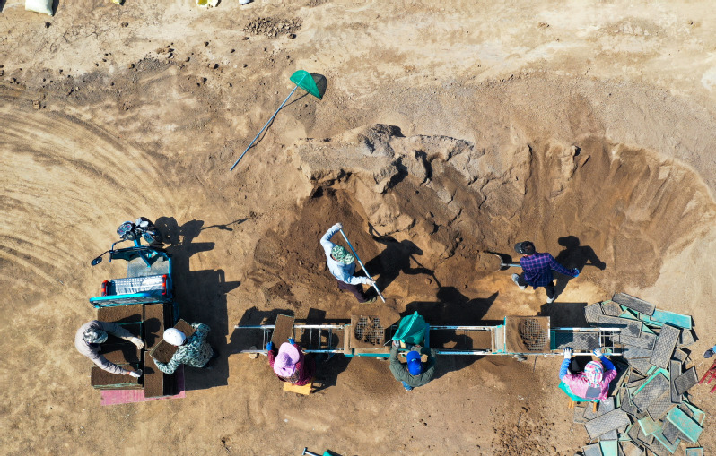 5月1日,寶應湖農(nóng)場三分場場頭一派忙碌,擺盤、鏟土、倒稻種,7、8名工人分工合作,有序進行著落谷育秧。