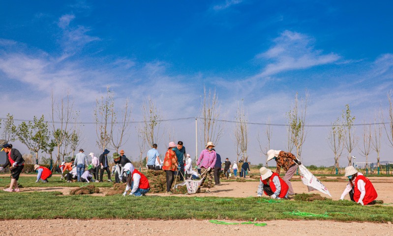 “草皮之間要留有空隙,讓它的根可以生長,大家鋪的時候注意一些。”“這邊的草皮馬上就要鋪完了,快讓運送車再裝一車草皮過來。”……
