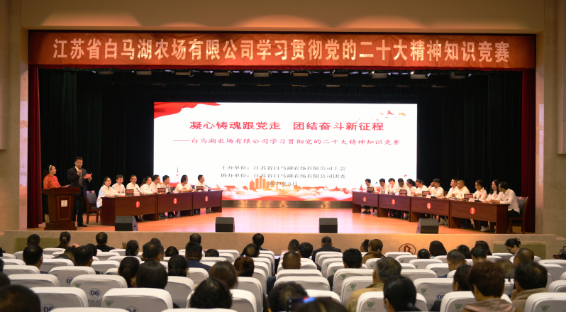 5月5日,白馬湖農(nóng)場公司“凝心鑄魂跟黨走 團結(jié)奮斗新征程”學習貫徹黨的二十大精神知識競賽在職工禮堂火熱開賽。黨委書記、董事長韓正光,黨委副書記、總經(jīng)理韓樹明,副總經(jīng)理衡愛軍,紀委負責人時奎敬,第二片區(qū)財務總監(jiān)奚興林出席競賽。來自機關和各單位的21支代表隊共計63人參加競賽。