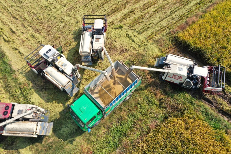 10月17日,寶應(yīng)湖農(nóng)場(chǎng)5萬(wàn)畝稻田開(kāi)鐮試割。三四臺(tái)收割機(jī)來(lái)回穿梭、相互協(xié)作,粒粒飽滿的水稻收割脫粒,很快就被裝進(jìn)運(yùn)輸車(chē)?yán)?,隨后運(yùn)送至場(chǎng)頭過(guò)磅晾曬。農(nóng)技人員穿梭在剛收割完畢的田塊里,根據(jù)收割機(jī)的實(shí)際收割質(zhì)量,進(jìn)行指揮調(diào)整,把“豐收在望”變成“豐收在手”。