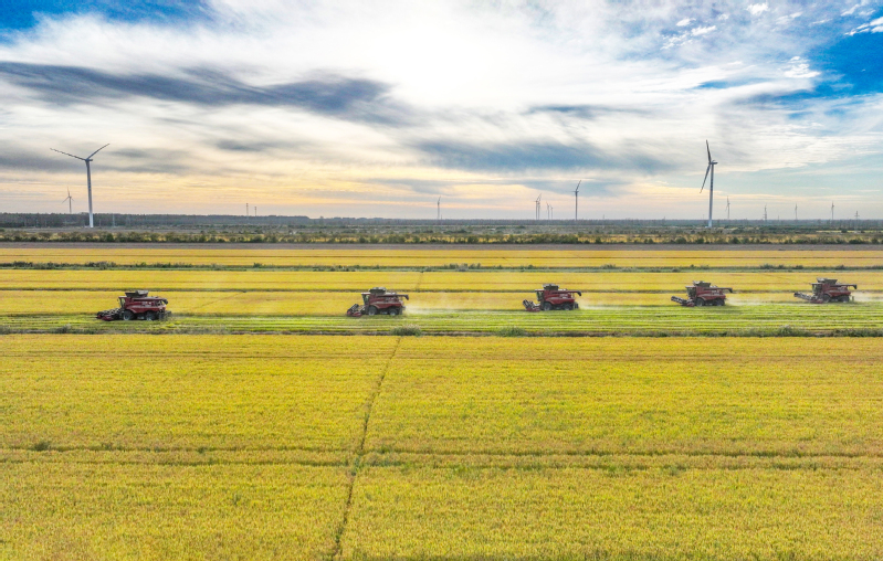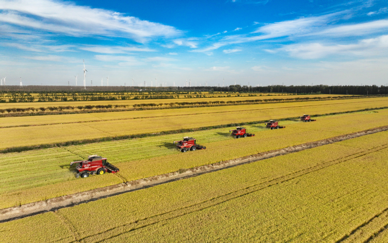 2023年10月28日,在蘇墾農(nóng)發(fā)新洋分公司新南生產(chǎn)區(qū)19大隊(duì)的高標(biāo)準(zhǔn)農(nóng)田上,五臺凱斯7088大型聯(lián)合收割機(jī)穿梭在稻田中搶收水稻。蘇墾農(nóng)發(fā)新洋分公司搶抓晴好天氣,發(fā)揮農(nóng)墾企業(yè)機(jī)械化優(yōu)勢,確保秋糧顆粒歸倉。