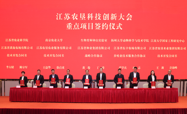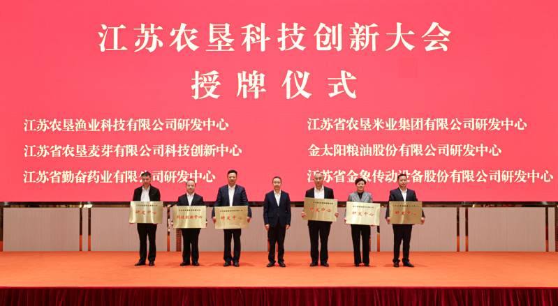 會上,吳本輝、姜建友共同為江蘇農墾漁業(yè)科技有限公司和江蘇省農墾產業(yè)技術研究院有限責任公司揭牌,吳本輝為蘇墾漁業(yè)研發(fā)中心、蘇墾米業(yè)研發(fā)中心、蘇墾麥芽科技創(chuàng)新中心、金太陽糧油研發(fā)中心、勤奮藥業(yè)研發(fā)中心、金象傳動研發(fā)中心授牌,姜建友發(fā)布江蘇農墾2024-2025年揭榜掛帥項目榜單,生物育種鐘山實驗室、省農科院、南京農業(yè)大學、江南大學、揚州大學分別與集團公司所屬企業(yè)簽署重點項目合作協(xié)議。