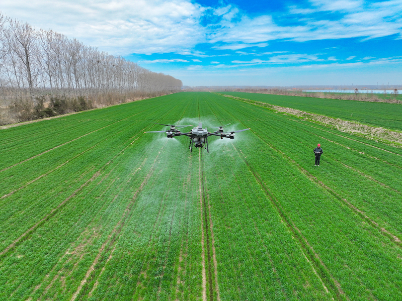 3月13日,江蘇省鹽城市射陽縣,在江蘇農墾新洋農場的一處高標準農田里,農技人員正在操縱一臺新式植保無人機,為小麥開展春季施肥作業(yè)。當前,新洋農場6萬畝高標準農業(yè)生產基地進入春管關鍵階段,該農場搶抓農時,積極開展春季田管作業(yè),助力夏糧穩(wěn)產增收。