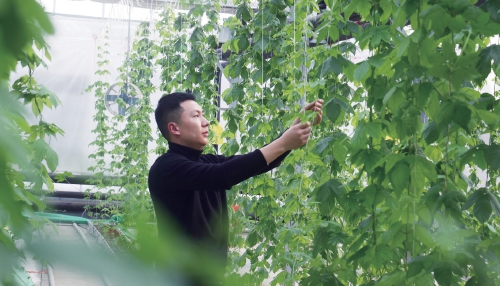 江蘇農(nóng)墾集團(tuán)云臺(tái)農(nóng)場(chǎng)利用資源優(yōu)勢(shì),積極與龍頭企業(yè)、科研機(jī)構(gòu)對(duì)接,開發(fā)特色種植。目前,與蘇墾麥芽公司訂單種植的大棚啤酒花長(zhǎng)勢(shì)喜人。圖為技術(shù)人員正在為新長(zhǎng)出的啤酒花側(cè)枝繞蔓?! 〕誊姟z