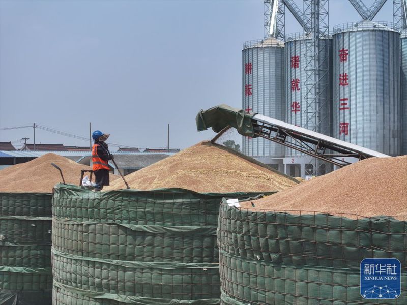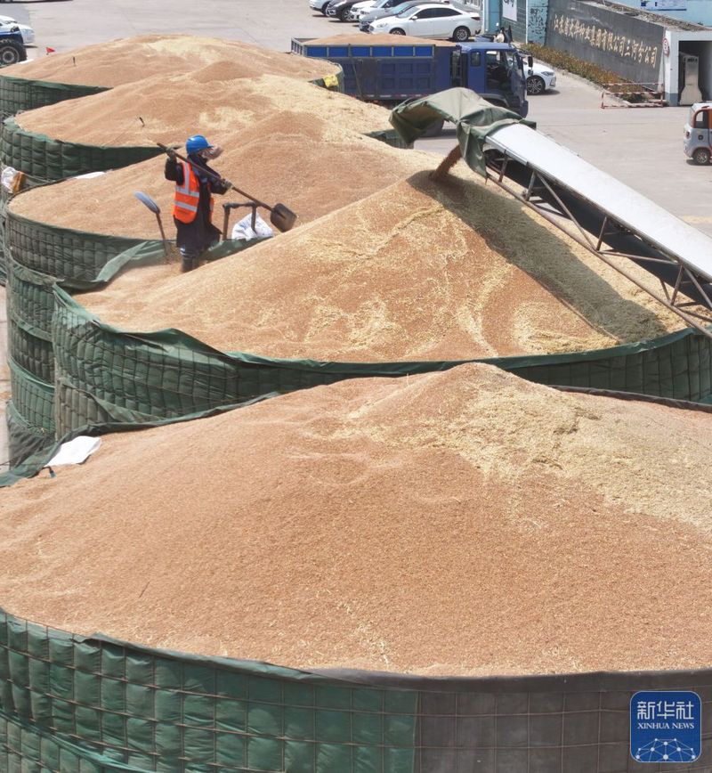 三河農(nóng)場收獲的小麥進(jìn)入大華種業(yè)三河分公司存儲(5月28日攝,無人機(jī)照片)。新華社發(fā)(許昌銀攝)