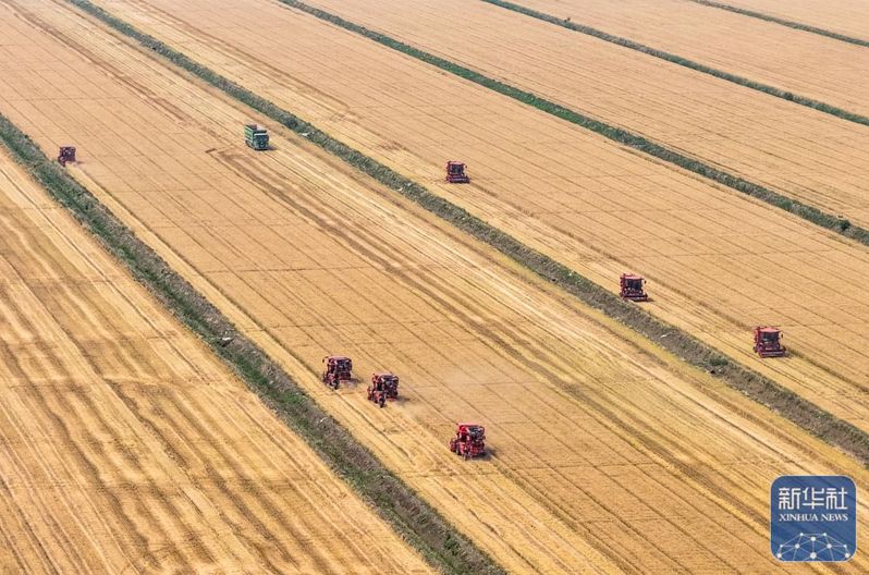 5月28日,收割機(jī)在三河農(nóng)場收割小麥(無人機(jī)照片)。新華社記者 季春鵬 攝