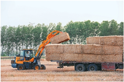 在江蘇省連云港市海州區(qū)的江蘇農(nóng)墾崗埠農(nóng)場(chǎng),農(nóng)民在田間打捆回收小麥秸稈,進(jìn)行集中轉(zhuǎn)運(yùn)堆放。