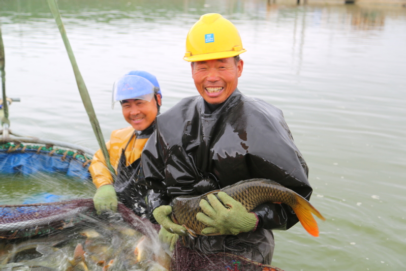 正值淡水魚(yú)出塘上市季節(jié),江蘇省連云港市海州區(qū)江蘇農(nóng)墾崗埠農(nóng)場(chǎng)南漁場(chǎng),大型吊車正在起網(wǎng)捕撈鯉魚(yú),一幅人歡魚(yú)躍的水上夏收景象。圖為漁民在展示捕撈的大鯉魚(yú)?! ⌒煨l(wèi) 攝(來(lái)源:大國(guó)三農(nóng))