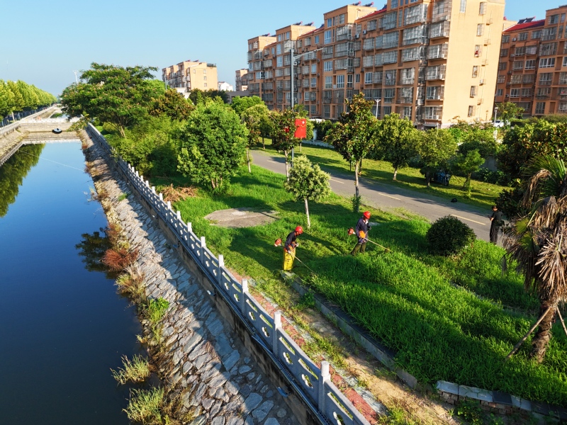 連日來,連云港市海州區(qū)加緊推進(jìn)環(huán)境綜合整治工作,著力打造“河暢、水清、岸綠、景美”的優(yōu)美環(huán)境。圖為8月21日,位于該區(qū)的江蘇農(nóng)墾崗埠農(nóng)場(chǎng)綠化工人在振興河畔修剪管護(hù)草坪。