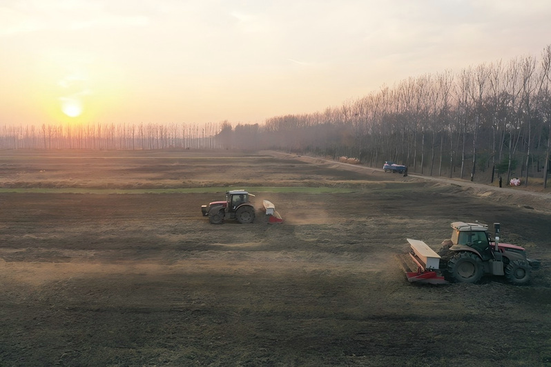 近日,連云港市海州區(qū),播種機(jī)正在江蘇農(nóng)墾崗埠農(nóng)場(chǎng)高標(biāo)準(zhǔn)農(nóng)田里播種小麥。當(dāng)?shù)芈毠ふ趽屪マr(nóng)時(shí),進(jìn)行小麥播種工作,為明年糧食豐收打好基礎(chǔ)。