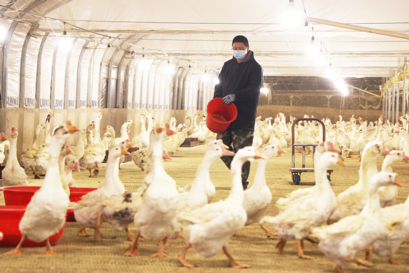 在臨海農(nóng)場(chǎng)種鵝養(yǎng)殖基地的鵝棚內(nèi),青年養(yǎng)殖人員正專(zhuān)心進(jìn)行喂食、撿蛋工作。