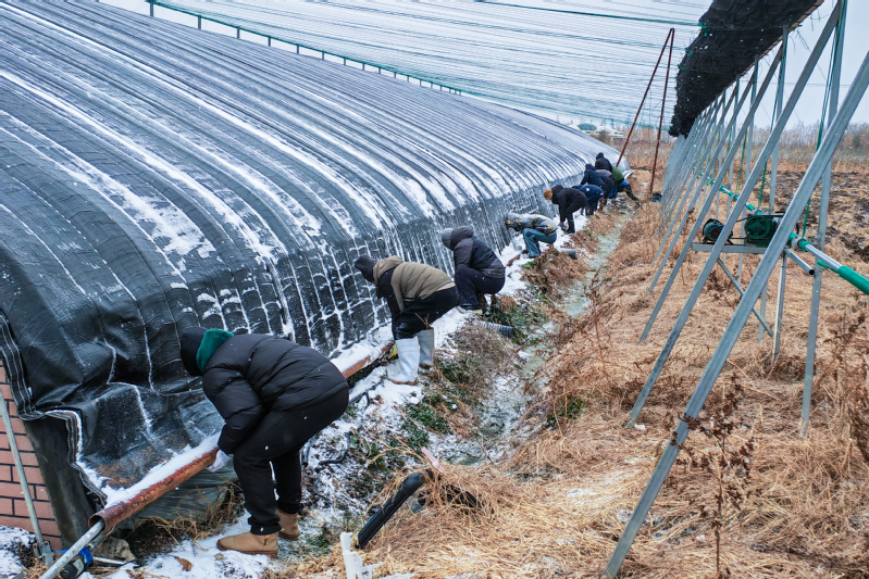 面對(duì)大風(fēng)和積雪壓力,設(shè)施結(jié)構(gòu)的穩(wěn)固是第一道關(guān)卡?!耙?、二、三!大家不要松手,再加把勁?!?月18日一大早,為應(yīng)對(duì)寒潮,高效農(nóng)業(yè)示范園第一時(shí)間組織人員對(duì)園區(qū)內(nèi)所有大棚進(jìn)行全面加固。同時(shí),對(duì)保溫棉被進(jìn)行檢修和更換,確保其保溫性能處于最佳狀態(tài)。同樣,在云臺(tái)農(nóng)場(chǎng)云水灣景區(qū),技術(shù)團(tuán)隊(duì)也提前完成了所有生產(chǎn)大棚的結(jié)構(gòu)檢查與加固,重點(diǎn)提升設(shè)施的物理抗逆能力,云水灣景區(qū)負(fù)責(zé)人崔婷婷介紹道,“所有棚室的通風(fēng)口均已提前密封,并儲(chǔ)備了充足的專用保溫被,用于夜間覆蓋以有效蓄熱。例如在藍(lán)莓種植區(qū),我們特別采取了‘雙層覆膜+加厚保溫被’的強(qiáng)化方案,全力鎖住溫度。工作人員也加強(qiáng)了監(jiān)控和維護(hù),確保農(nóng)作物的健康生長(zhǎng)?!?/p>