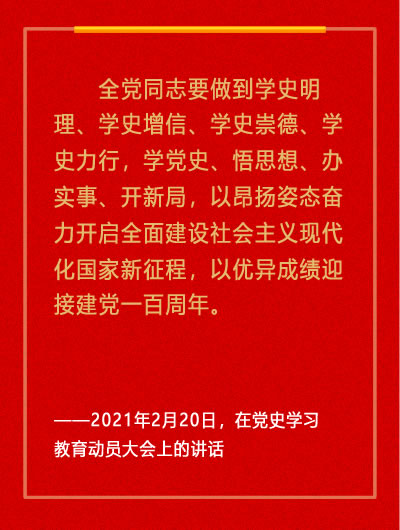 馬克思主義政黨的先進(jìn)性,首先體現(xiàn)為思想理論上的先進(jìn)。百年來,我們黨之所以能不負(fù)歷史和人民重托,闖過重重險(xiǎn)關(guān),關(guān)鍵在于堅(jiān)持理論和實(shí)踐相結(jié)合,不斷用科學(xué)理論指導(dǎo)偉大實(shí)踐。習(xí)近平新時(shí)代中國特色社會主義思想是當(dāng)代中國馬克思主義、21世紀(jì)馬克思主義。用這一科學(xué)理論武裝頭腦、指導(dǎo)實(shí)踐、推動工作,是最大的政治任務(wù)。在黨史學(xué)習(xí)教育中,黨員干部必須在學(xué)懂弄通做實(shí)習(xí)近平新時(shí)代中國特色社會主義思想上狠下功夫,不斷深化對這一黨的創(chuàng)新理論的精神實(shí)質(zhì)和豐富內(nèi)涵的認(rèn)識,堅(jiān)持學(xué)思用貫通、知信行統(tǒng)一,堅(jiān)持不懈用習(xí)近平新時(shí)代中國特色社會主義思想武裝頭腦、指導(dǎo)實(shí)踐、推動工作。要在學(xué)習(xí)中努力追求進(jìn)步提升。自我滿足無疑是學(xué)習(xí)最大的敵人,要學(xué)有所成,就必須永不自滿。要堅(jiān)決糾正對理論學(xué)習(xí)不重視、把理論學(xué)習(xí)當(dāng)任務(wù)等不良學(xué)習(xí)態(tài)度,堅(jiān)決克服理論學(xué)習(xí)淺嘗輒止、不求甚解等問題,堅(jiān)決防范學(xué)用脫節(jié)、學(xué)習(xí)碎片化隨意化等現(xiàn)象,不斷提高理論素養(yǎng)、政治素養(yǎng),提升運(yùn)用黨的創(chuàng)新理論推動工作、解決問題的能力。要在學(xué)習(xí)中進(jìn)一步樹立創(chuàng)新突破意識。好學(xué)才能上進(jìn)。中國共產(chǎn)黨人依靠學(xué)習(xí)走到今天,也必然要依靠學(xué)習(xí)走向未來。在新時(shí)代,如果我們的思想還停留在過去,那么,看問