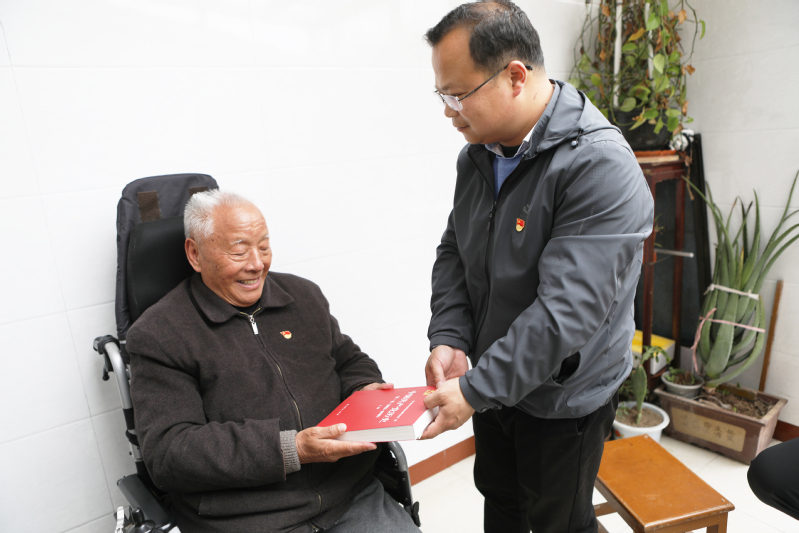 在“送學(xué)上門”活動中,工作人員每到一戶黨員家中,都與老黨員促膝交談,詳細詢問身體和生活狀況,向老黨員介紹開展黨史學(xué)習(xí)教育的具體情況,與老黨員一起學(xué)習(xí)黨史,使他們不出家門就能及時了解黨的最新方針政策,增強對黨組織的歸屬感,切實把黨史學(xué)習(xí)教育落到實處。并認真聽取他們對學(xué)習(xí)教育的看法和建議,鼓勵他們繼續(xù)發(fā)揮黨員先鋒模范作用,為農(nóng)場經(jīng)濟社會發(fā)展獻言獻策?!拔译m行動不便,但思想不能落伍,非常感謝你們給我送來這些學(xué)習(xí)資料,我一定好好學(xué)黨史,不忘初心跟黨走?!蓖醯拥乩w丙華的手,感慨地說道。