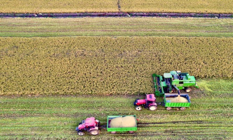 秋風(fēng)拂過(guò),稻菽飄香。眼下,正值水稻收割季節(jié),云臺(tái)大地一片金黃。10月22日,蘇墾農(nóng)發(fā)云臺(tái)分公司6000余畝水稻開鐮收割,在田間奏響“豐收曲”。機(jī)械轟鳴,沉甸甸的稻穗被攬入“懷中”,收割、脫粒、裝車,飽滿的谷粒傾瀉而下,被裝進(jìn)運(yùn)糧車?yán)?,工作人員美滋滋地看著田間的稻谷被收割殆盡,空氣中彌漫著稻谷的醇香?!敖衲晡覀兊乃鹃L(zhǎng)勢(shì)好、產(chǎn)量高,和我們以‘繡花功夫’狠抓精細(xì)化管理是分不開的?!痹婆_(tái)農(nóng)場(chǎng)公司黨委副書記、蘇墾農(nóng)發(fā)云臺(tái)分公司總經(jīng)理宋光鋒在收割現(xiàn)場(chǎng)會(huì)滿意地說(shuō)道。鄉(xiāng)村振興的核心是產(chǎn)業(yè)興旺,現(xiàn)代農(nóng)業(yè)是云臺(tái)產(chǎn)業(yè)興旺的中堅(jiān)力量。近年來(lái),蘇墾農(nóng)發(fā)云臺(tái)分公司堅(jiān)持標(biāo)準(zhǔn)化生產(chǎn)方式,將技術(shù)、人才、信息等資源要素“引”向農(nóng)業(yè)、“流”向企業(yè),充分發(fā)揮國(guó)有農(nóng)業(yè)企業(yè)帶頭作用,為農(nóng)業(yè)產(chǎn)業(yè)發(fā)展注入新的活力。據(jù)了解,今年“三秋”,云臺(tái)將投入小型收割機(jī)20臺(tái)用于水稻收割,并投入播種機(jī)13臺(tái),預(yù)計(jì)本月28日全部收割完畢,稻茬小麥將于31日播種結(jié)束。下一步,云臺(tái)將扎實(shí)做好秋收秋種秋管工作,牢牢守住“糧袋子”,為推進(jìn)鄉(xiāng)村振興和糧食安全貢獻(xiàn)云臺(tái)力量。