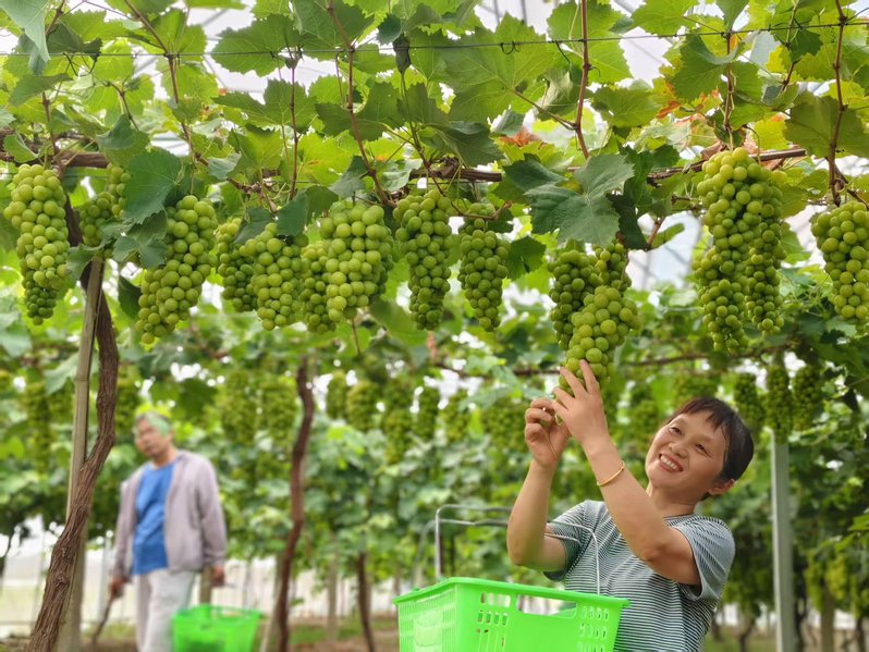 “海農(nóng)葡萄”引八方葡友前來采摘、觀賞。圖為一位顧客雙手輕托飽滿青綠的葡萄串,仰頭注視,在綠葉與累累果實環(huán)繞間,盡顯田園采摘的愜意與對果實的欣賞。