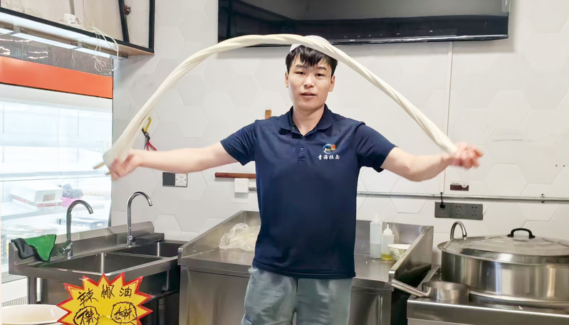 為支持青海拉面“四進”活動開展,中山精品酒店在1樓嘉年華超市單獨開辟一處給青海河湟拉面產(chǎn)業(yè)運營有限公司制作銷售拉面,實行0租金使用。圖為工作人員在制作拉面場景。