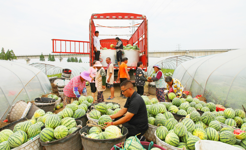 炎炎夏日,暑氣蒸騰,江心沙農(nóng)場二茬西瓜迎來銷售旺季。圖為工人正忙著將剛剛采摘的西瓜裝車發(fā)往蘇南和上海等周邊城市。